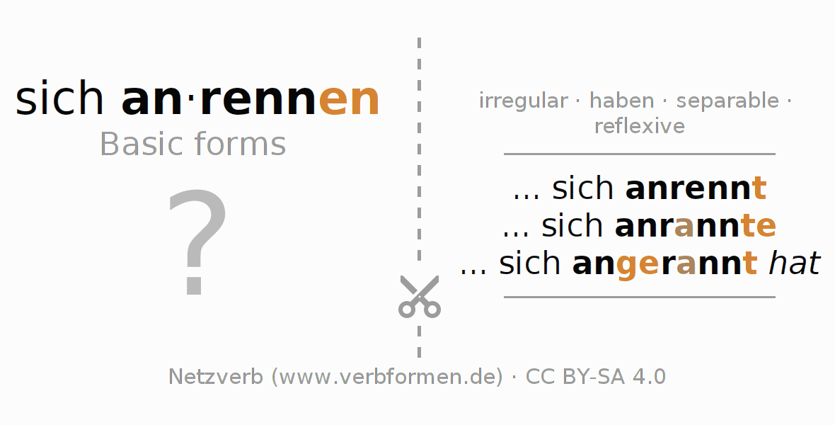 Worksheets are used generally for the conjugation of the verb anrennen in teaching. The materials can be used as Open Educational Resources (OER) for exercises, for games and as Tasks (CC BY-SA 4.0). There are many different types of tasks available for the verb sich anrennen (hat). These are overview sheets with complete conjugation, puzzles and games that require joint learning. The entire educational material is available for free as a PDF download, as pictures and as an interactive browser version. In addition to the tasks, countless examples for anrennen also provide an aid to using the verb.