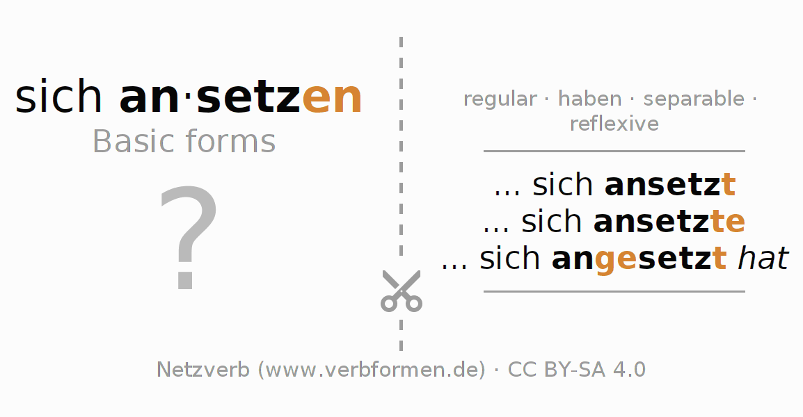 Worksheets are used generally for the conjugation of the verb ansetzen in teaching. The materials can be used as Open Educational Resources (OER) for exercises, for games and as Tasks (CC BY-SA 4.0). There are many different types of tasks available for the verb sich ansetzen. These are overview sheets with complete conjugation, puzzles and games that require joint learning. The entire educational material is available for free as a PDF download, as pictures and as an interactive browser version. In addition to the tasks, countless examples for ansetzen also provide an aid to using the verb.