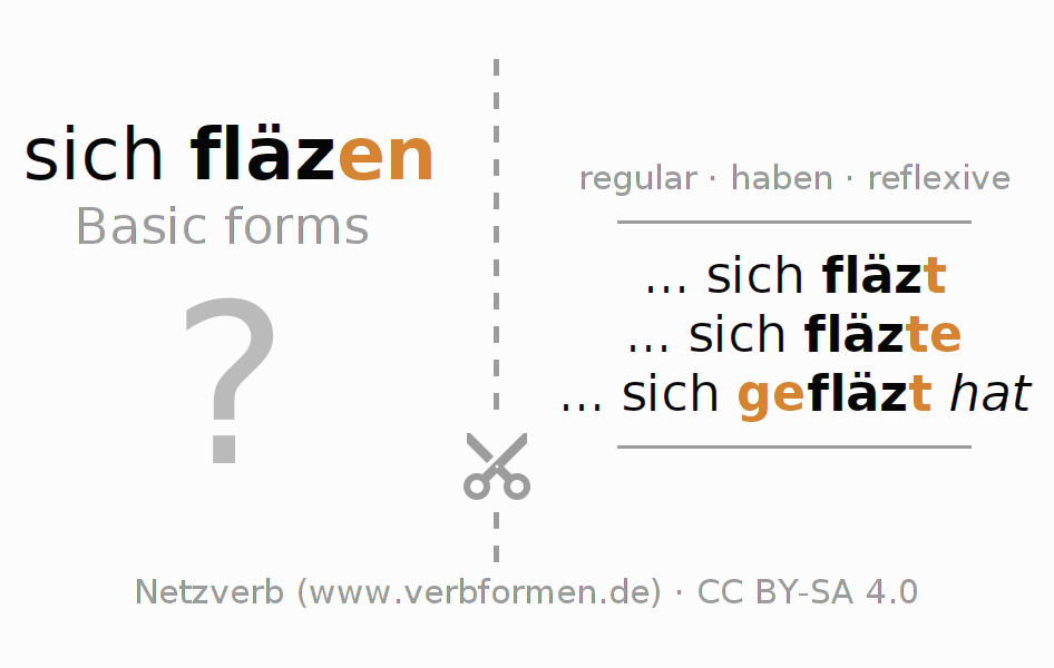 Worksheets are used generally for the conjugation of the verb fläzen in teaching. The materials can be used as Open Educational Resources (OER) for exercises, for games and as Tasks (CC BY-SA 4.0). There are many different types of tasks available for the verb sich fläzen. These are overview sheets with complete conjugation, puzzles and games that require joint learning. The entire educational material is available for free as a PDF download, as pictures and as an interactive browser version. In addition to the tasks, countless examples for fläzen also provide an aid to using the verb.