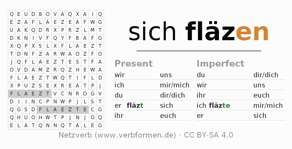 With these search word puzzles you can learn the conjugation of the German verb sich fläzen.