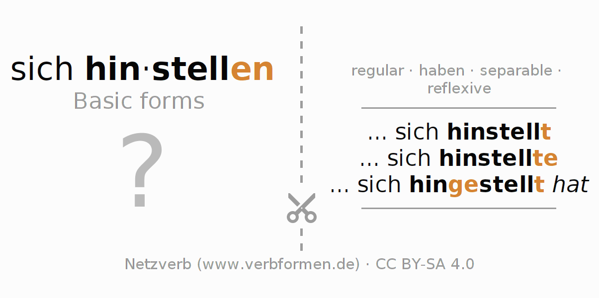 Worksheets are used generally for the conjugation of the verb hinstellen in teaching. The materials can be used as Open Educational Resources (OER) for exercises, for games and as Tasks (CC BY-SA 4.0). There are many different types of tasks available for the verb sich hinstellen. These are overview sheets with complete conjugation, puzzles and games that require joint learning. The entire educational material is available for free as a PDF download, as pictures and as an interactive browser version. In addition to the tasks, countless examples for hinstellen also provide an aid to using the verb.