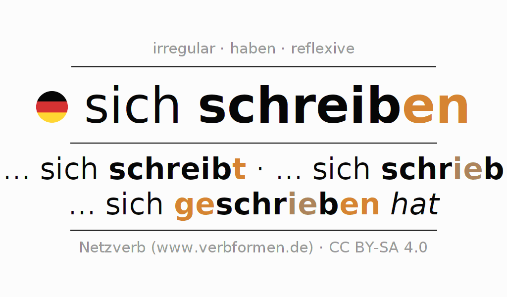Worksheets are used generally for the conjugation of the verb schreiben in teaching. The materials can be used as Open Educational Resources (OER) for exercises, for games and as Tasks (CC BY-SA 4.0). There are many different types of tasks available for the verb sich schreiben. These are overview sheets with complete conjugation, puzzles and games that require joint learning. The entire educational material is available for free as a PDF download, as pictures and as an interactive browser version. In addition to the tasks, countless examples for schreiben also provide an aid to using the verb.