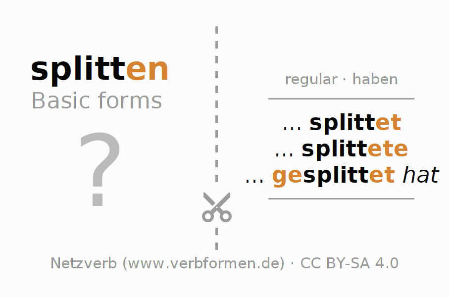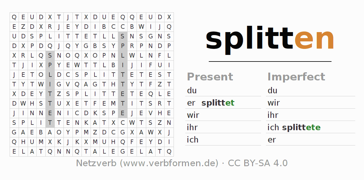 Worksheets are used generally for the conjugation of the verb splitten in teaching. The materials can be used as Open Educational Resources (OER) for exercises, for games and as Tasks (CC BY-SA 4.0). There are many different types of tasks available for the verb splitten. These are overview sheets with complete conjugation, puzzles and games that require joint learning. The entire educational material is available for free as a PDF download, as pictures and as an interactive browser version. In addition to the tasks, countless examples for splitten also provide an aid to using the verb.