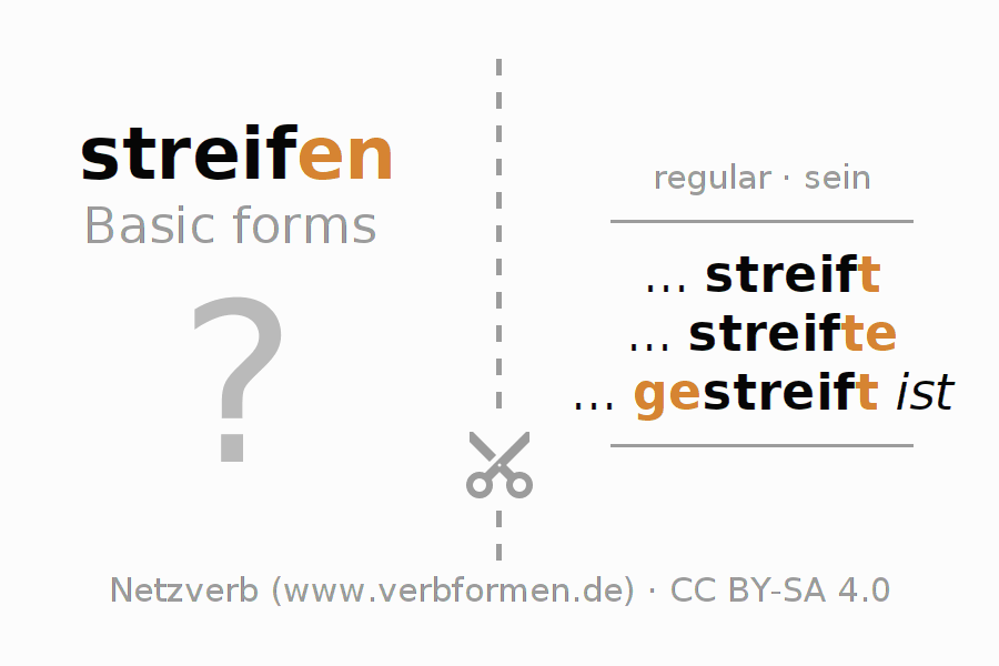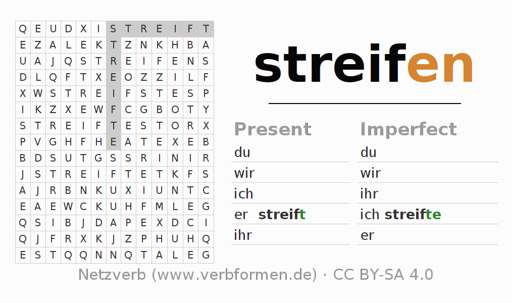 Worksheets are used generally for the conjugation of the verb streifen in teaching. The materials can be used as Open Educational Resources (OER) for exercises, for games and as Tasks (CC BY-SA 4.0). There are many different types of tasks available for the verb streifen (ist). These are overview sheets with complete conjugation, puzzles and games that require joint learning. The entire educational material is available for free as a PDF download, as pictures and as an interactive browser version. In addition to the tasks, countless examples for streifen also provide an aid to using the verb.