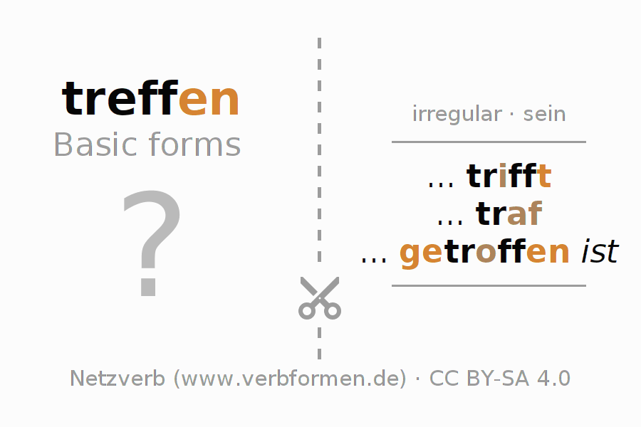 Worksheets are used generally for the conjugation of the verb treffen in teaching. The materials can be used as Open Educational Resources (OER) for exercises, for games and as Tasks (CC BY-SA 4.0). There are many different types of tasks available for the verb treffen (ist). These are overview sheets with complete conjugation, puzzles and games that require joint learning. The entire educational material is available for free as a PDF download, as pictures and as an interactive browser version. In addition to the tasks, countless examples for treffen also provide an aid to using the verb.