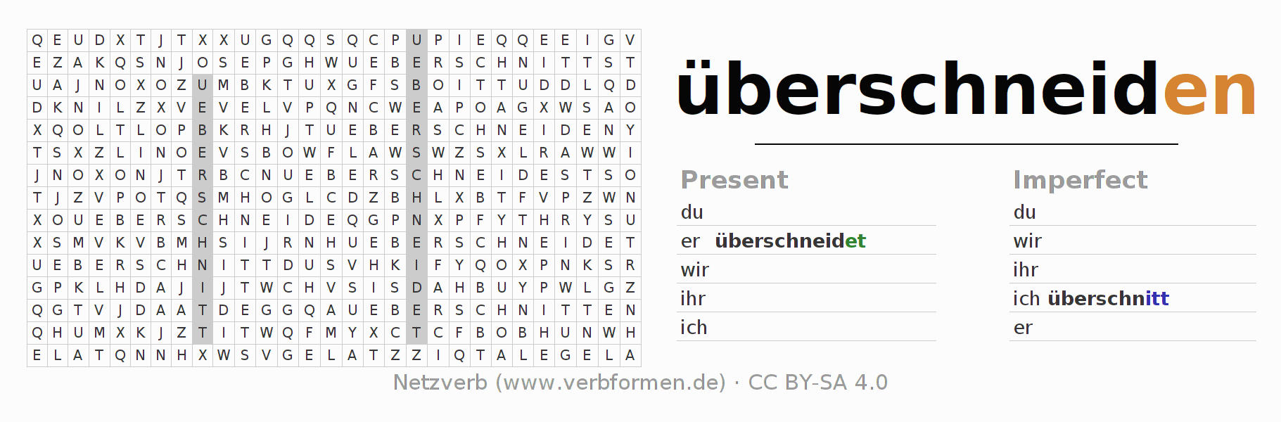 With these search word puzzles you can learn the conjugation of the German verb überschneiden.