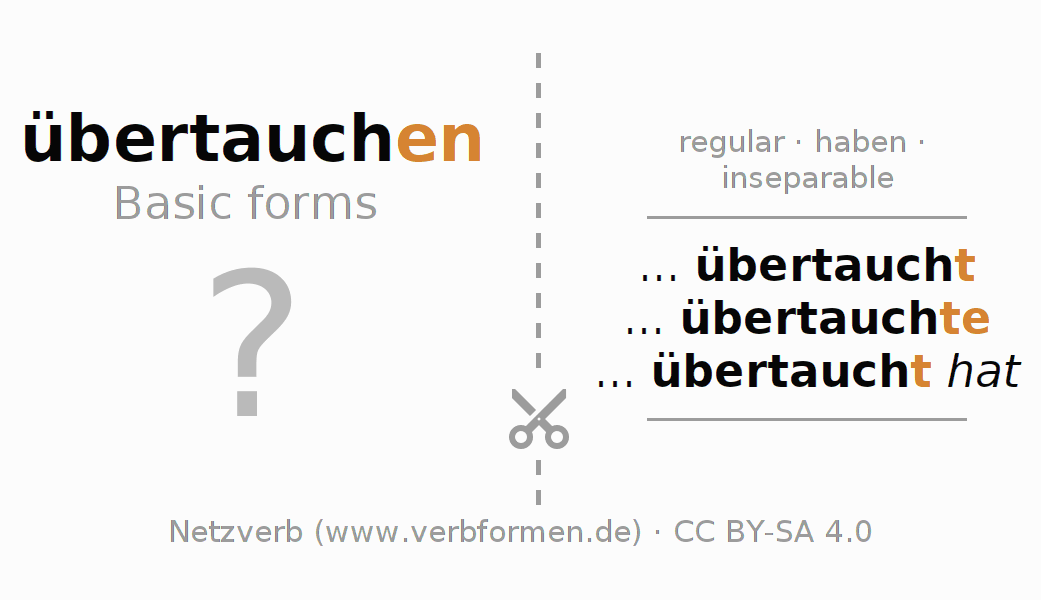 Worksheets are used generally for the conjugation of the verb übertauchen in teaching. The materials can be used as Open Educational Resources (OER) for exercises, for games and as Tasks (CC BY-SA 4.0). There are many different types of tasks available for the verb übertauchen. These are overview sheets with complete conjugation, puzzles and games that require joint learning. The entire educational material is available for free as a PDF download, as pictures and as an interactive browser version. In addition to the tasks, countless examples for übertauchen also provide an aid to using the verb.