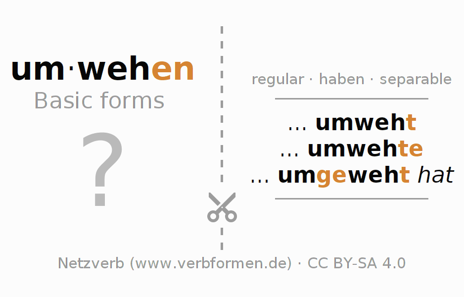 Worksheets are used generally for the conjugation of the verb umwehen in teaching. The materials can be used as Open Educational Resources (OER) for exercises, for games and as Tasks (CC BY-SA 4.0). There are many different types of tasks available for the verb um-wehen. These are overview sheets with complete conjugation, puzzles and games that require joint learning. The entire educational material is available for free as a PDF download, as pictures and as an interactive browser version. In addition to the tasks, countless examples for umwehen also provide an aid to using the verb.