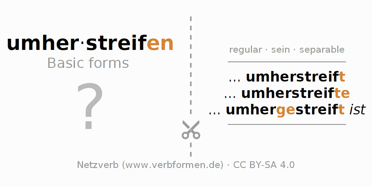 Worksheets are used generally for the conjugation of the verb umherstreifen in teaching. The materials can be used as Open Educational Resources (OER) for exercises, for games and as Tasks (CC BY-SA 4.0). There are many different types of tasks available for the verb umherstreifen. These are overview sheets with complete conjugation, puzzles and games that require joint learning. The entire educational material is available for free as a PDF download, as pictures and as an interactive browser version. In addition to the tasks, countless examples for umherstreifen also provide an aid to using the verb.
