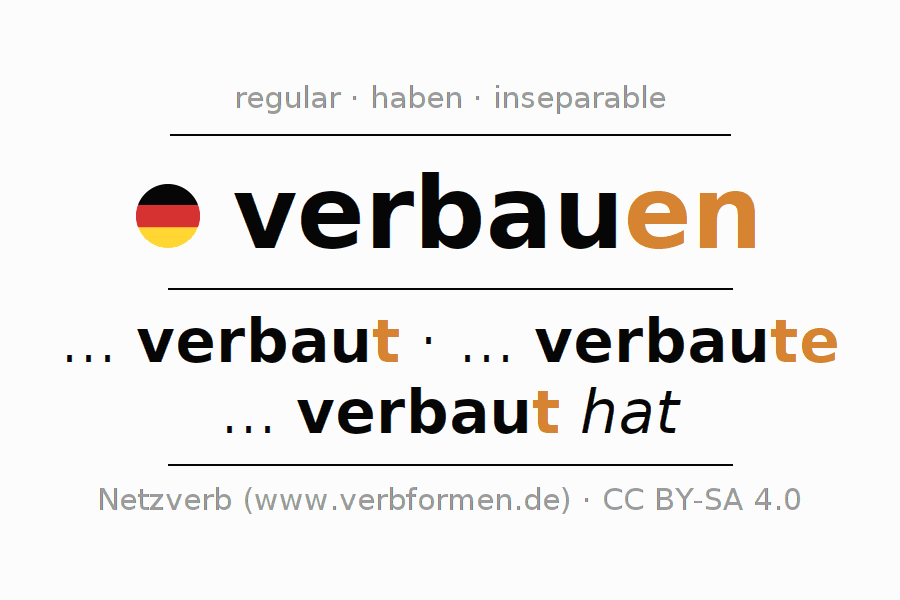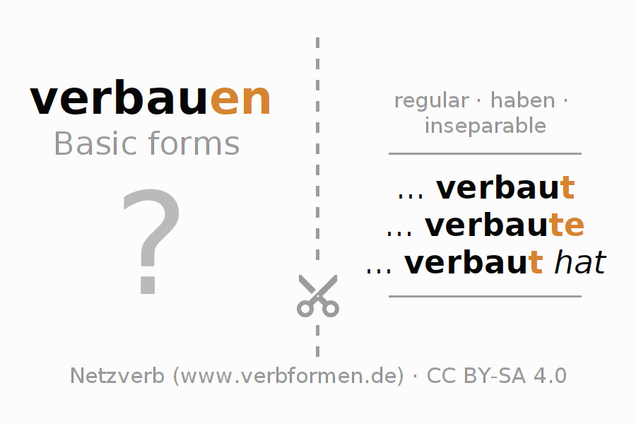 Worksheets are used generally for the conjugation of the verb verbauen in teaching. The materials can be used as Open Educational Resources (OER) for exercises, for games and as Tasks (CC BY-SA 4.0). There are many different types of tasks available for the verb verbauen. These are overview sheets with complete conjugation, puzzles and games that require joint learning. The entire educational material is available for free as a PDF download, as pictures and as an interactive browser version. In addition to the tasks, countless examples for verbauen also provide an aid to using the verb.
