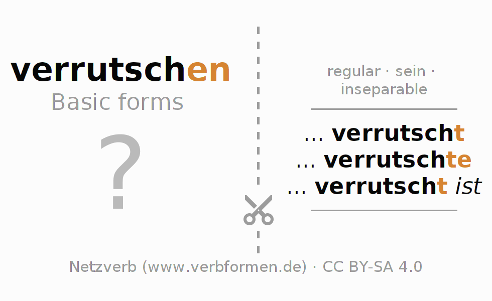 Worksheets are used generally for the conjugation of the verb verrutschen in teaching. The materials can be used as Open Educational Resources (OER) for exercises, for games and as Tasks (CC BY-SA 4.0). There are many different types of tasks available for the verb verrutschen. These are overview sheets with complete conjugation, puzzles and games that require joint learning. The entire educational material is available for free as a PDF download, as pictures and as an interactive browser version. In addition to the tasks, countless examples for verrutschen also provide an aid to using the verb.