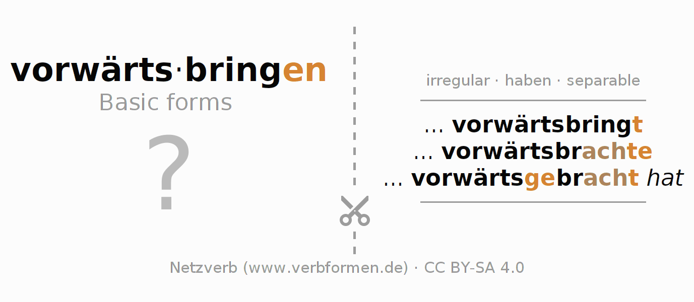 Worksheets are used generally for the conjugation of the verb vorwärtsbringen in teaching. The materials can be used as Open Educational Resources (OER) for exercises, for games and as Tasks (CC BY-SA 4.0). There are many different types of tasks available for the verb vorwärtsbringen. These are overview sheets with complete conjugation, puzzles and games that require joint learning. The entire educational material is available for free as a PDF download, as pictures and as an interactive browser version. In addition to the tasks, countless examples for vorwärtsbringen also provide an aid to using the verb.