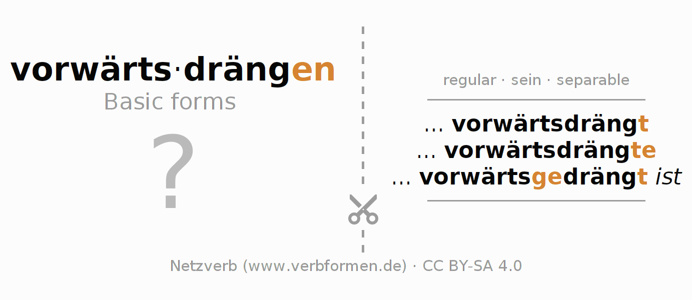 Worksheets are used generally for the conjugation of the verb vorwärtsdrängen in teaching. The materials can be used as Open Educational Resources (OER) for exercises, for games and as Tasks (CC BY-SA 4.0). There are many different types of tasks available for the verb vorwärtsdrängen. These are overview sheets with complete conjugation, puzzles and games that require joint learning. The entire educational material is available for free as a PDF download, as pictures and as an interactive browser version. In addition to the tasks, countless examples for vorwärtsdrängen also provide an aid to using the verb.