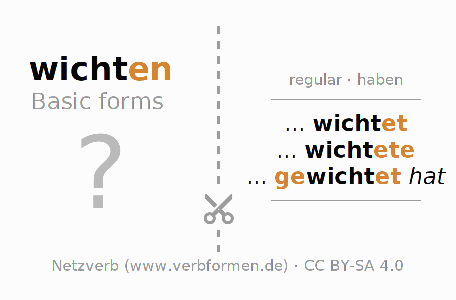 Worksheets are used generally for the conjugation of the verb wichten in teaching. The materials can be used as Open Educational Resources (OER) for exercises, for games and as Tasks (CC BY-SA 4.0). There are many different types of tasks available for the verb wichten. These are overview sheets with complete conjugation, puzzles and games that require joint learning. The entire educational material is available for free as a PDF download, as pictures and as an interactive browser version. In addition to the tasks, countless examples for wichten also provide an aid to using the verb.
