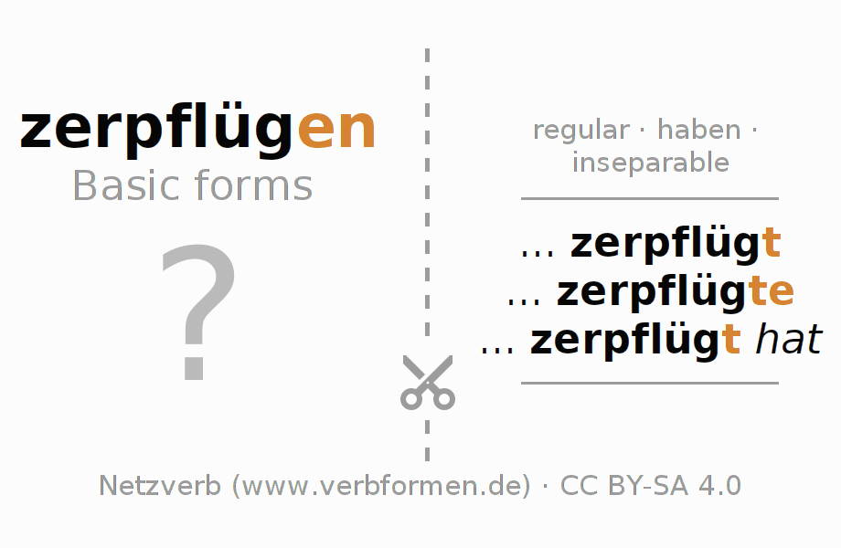 Worksheets are used generally for the conjugation of the verb zerpflügen in teaching. The materials can be used as Open Educational Resources (OER) for exercises, for games and as Tasks (CC BY-SA 4.0). There are many different types of tasks available for the verb zerpflügen. These are overview sheets with complete conjugation, puzzles and games that require joint learning. The entire educational material is available for free as a PDF download, as pictures and as an interactive browser version. In addition to the tasks, countless examples for zerpflügen also provide an aid to using the verb.