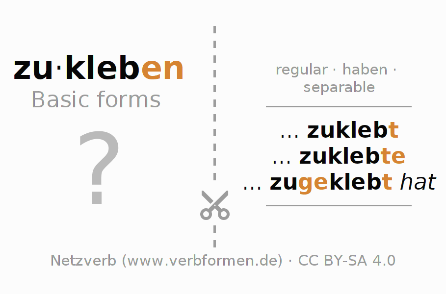 Worksheets are used generally for the conjugation of the verb zukleben in teaching. The materials can be used as Open Educational Resources (OER) for exercises, for games and as Tasks (CC BY-SA 4.0). There are many different types of tasks available for the verb zukleben. These are overview sheets with complete conjugation, puzzles and games that require joint learning. The entire educational material is available for free as a PDF download, as pictures and as an interactive browser version. In addition to the tasks, countless examples for zukleben also provide an aid to using the verb.