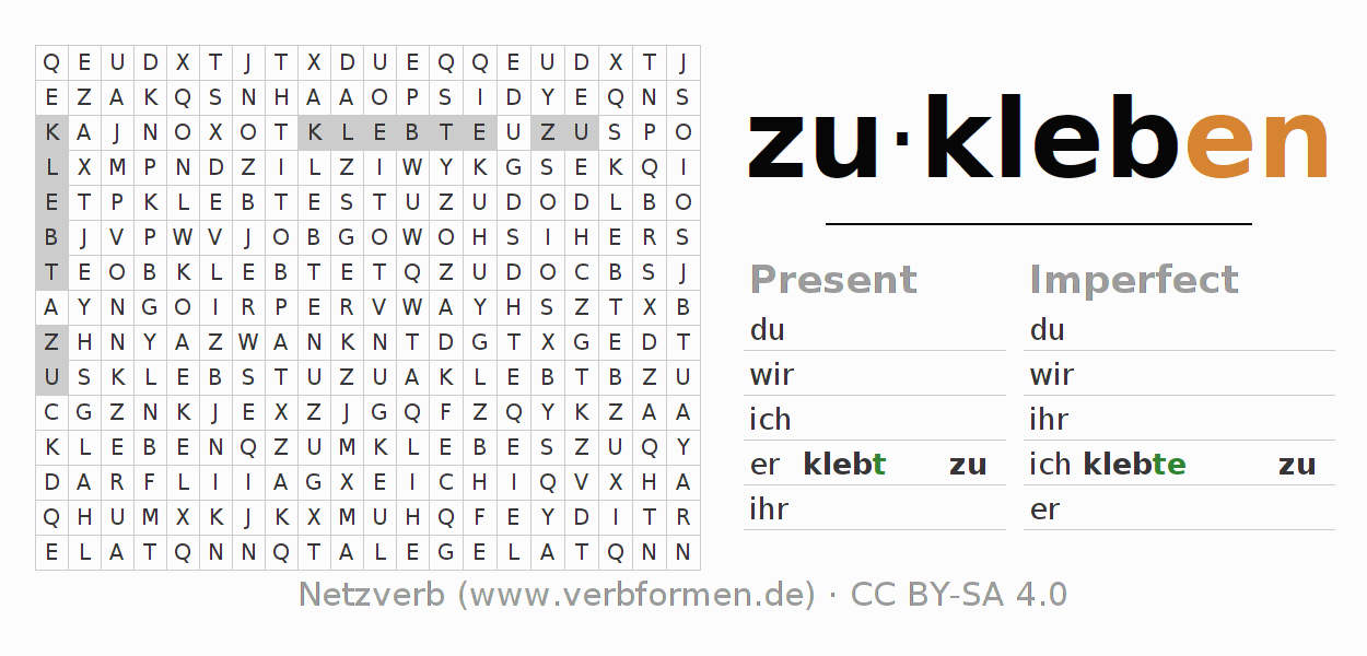 With these search word puzzles you can learn the conjugation of the German verb zukleben.