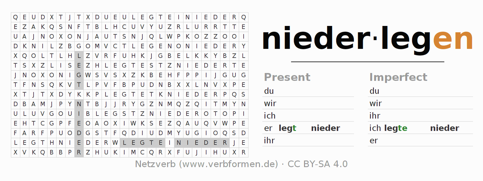 With these search word puzzles you can learn the conjugation of the German verb niederlegen.