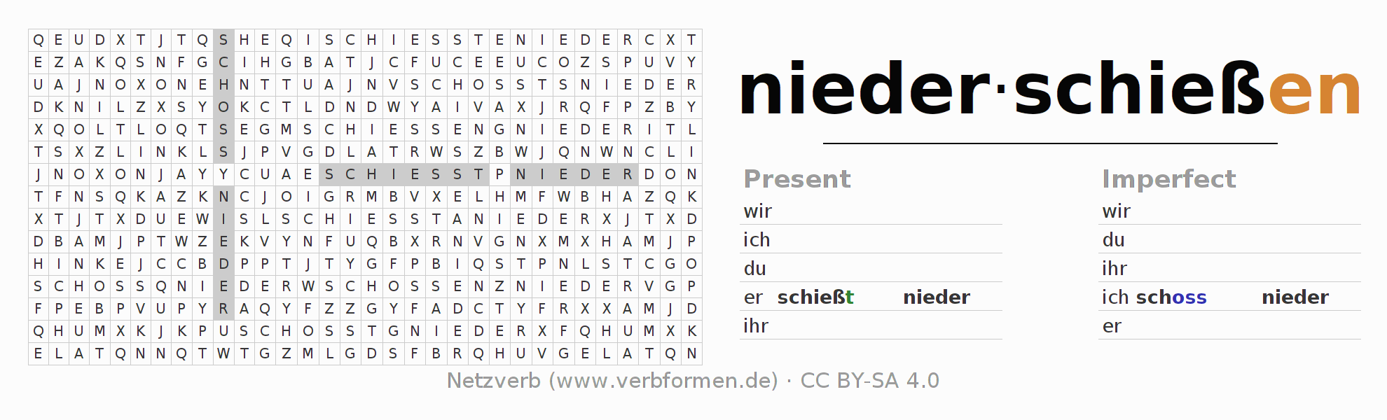 With these search word puzzles you can learn the conjugation of the German verb niederschießen.