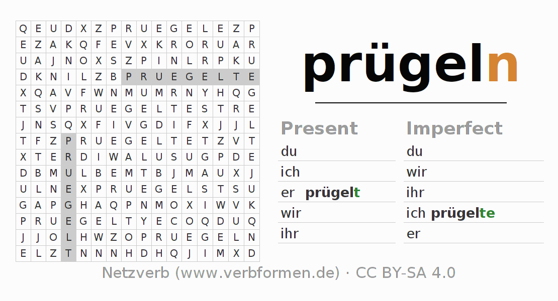 Worksheets are used generally for the conjugation of the verb prügeln in teaching. The materials can be used as Open Educational Resources (OER) for exercises, for games and as Tasks (CC BY-SA 4.0). There are many different types of tasks available for the verb prügeln. These are overview sheets with complete conjugation, puzzles and games that require joint learning. The entire educational material is available for free as a PDF download, as pictures and as an interactive browser version. In addition to the tasks, countless examples for prügeln also provide an aid to using the verb.