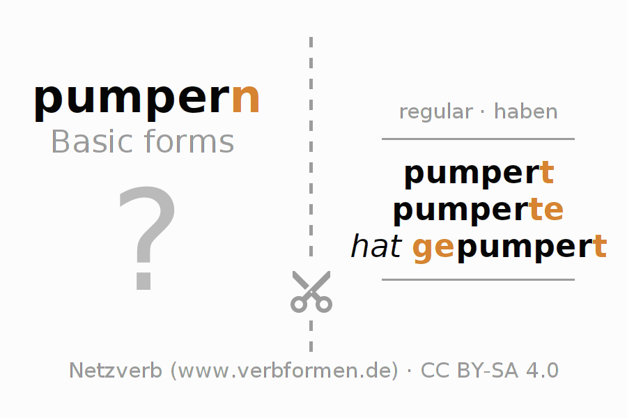 Worksheets are used generally for the conjugation of the verb pumpern in teaching. The materials can be used as Open Educational Resources (OER) for exercises, for games and as Tasks (CC BY-SA 4.0). There are many different types of tasks available for the verb pumpern. These are overview sheets with complete conjugation, puzzles and games that require joint learning. The entire educational material is available for free as a PDF download, as pictures and as an interactive browser version. In addition to the tasks, countless examples for pumpern also provide an aid to using the verb.