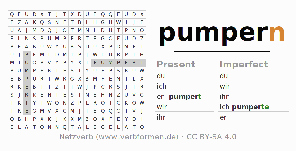 With these search word puzzles you can learn the conjugation of the German verb pumpern.