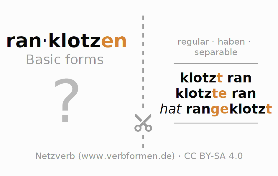 Worksheets are used generally for the conjugation of the verb ranklotzen in teaching. The materials can be used as Open Educational Resources (OER) for exercises, for games and as Tasks (CC BY-SA 4.0). There are many different types of tasks available for the verb ranklotzen. These are overview sheets with complete conjugation, puzzles and games that require joint learning. The entire educational material is available for free as a PDF download, as pictures and as an interactive browser version. In addition to the tasks, countless examples for ranklotzen also provide an aid to using the verb.