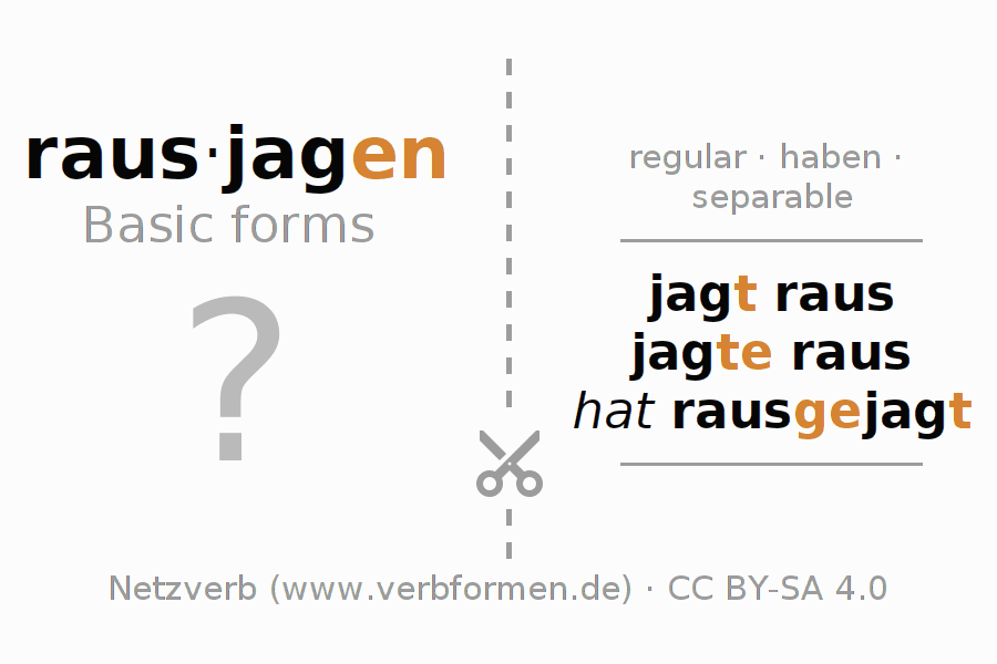 Worksheets are used generally for the conjugation of the verb rausjagen in teaching. The materials can be used as Open Educational Resources (OER) for exercises, for games and as Tasks (CC BY-SA 4.0). There are many different types of tasks available for the verb rausjagen. These are overview sheets with complete conjugation, puzzles and games that require joint learning. The entire educational material is available for free as a PDF download, as pictures and as an interactive browser version. In addition to the tasks, countless examples for rausjagen also provide an aid to using the verb.