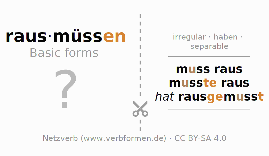 Worksheets are used generally for the conjugation of the verb rausmüssen in teaching. The materials can be used as Open Educational Resources (OER) for exercises, for games and as Tasks (CC BY-SA 4.0). There are many different types of tasks available for the verb rausmüssen. These are overview sheets with complete conjugation, puzzles and games that require joint learning. The entire educational material is available for free as a PDF download, as pictures and as an interactive browser version. In addition to the tasks, countless examples for rausmüssen also provide an aid to using the verb.