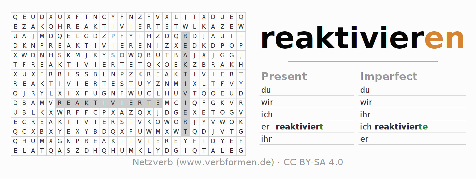 With these search word puzzles you can learn the conjugation of the German verb reaktivieren.