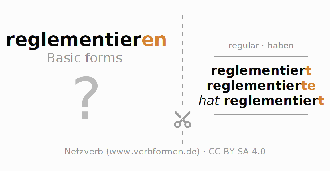 Worksheets are used generally for the conjugation of the verb reglementieren in teaching. The materials can be used as Open Educational Resources (OER) for exercises, for games and as Tasks (CC BY-SA 4.0). There are many different types of tasks available for the verb reglementieren. These are overview sheets with complete conjugation, puzzles and games that require joint learning. The entire educational material is available for free as a PDF download, as pictures and as an interactive browser version. In addition to the tasks, countless examples for reglementieren also provide an aid to using the verb.