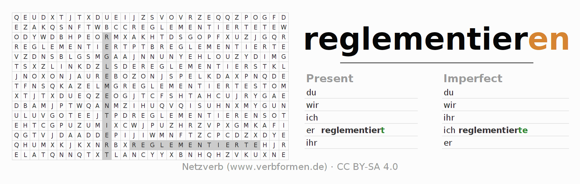 With these search word puzzles you can learn the conjugation of the German verb reglementieren.