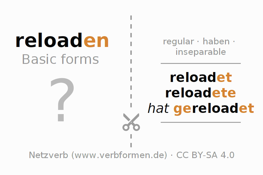 Worksheets are used generally for the conjugation of the verb reloaden in teaching. The materials can be used as Open Educational Resources (OER) for exercises, for games and as Tasks (CC BY-SA 4.0). There are many different types of tasks available for the verb reloaden. These are overview sheets with complete conjugation, puzzles and games that require joint learning. The entire educational material is available for free as a PDF download, as pictures and as an interactive browser version. In addition to the tasks, countless examples for reloaden also provide an aid to using the verb.
