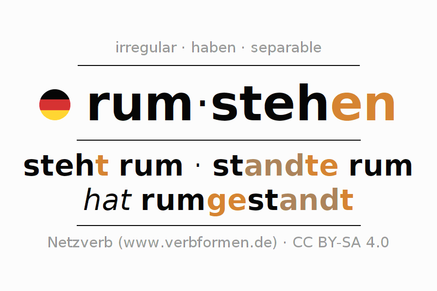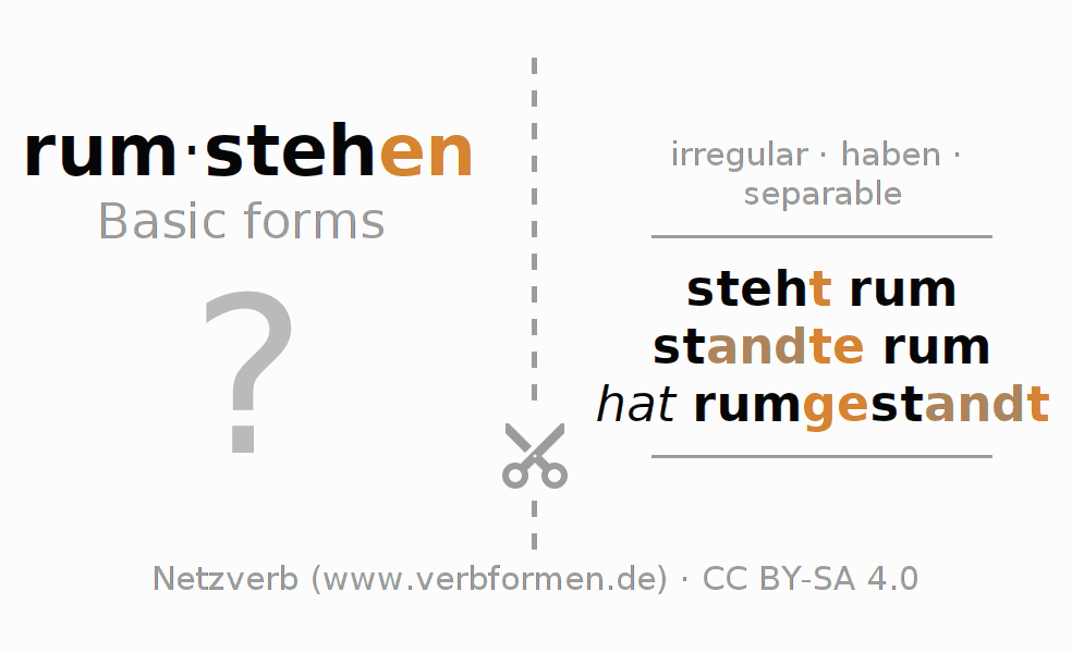 Worksheets are used generally for the conjugation of the verb rumstehen in teaching. The materials can be used as Open Educational Resources (OER) for exercises, for games and as Tasks (CC BY-SA 4.0). There are many different types of tasks available for the verb rumstehen. These are overview sheets with complete conjugation, puzzles and games that require joint learning. The entire educational material is available for free as a PDF download, as pictures and as an interactive browser version. In addition to the tasks, countless examples for rumstehen also provide an aid to using the verb.