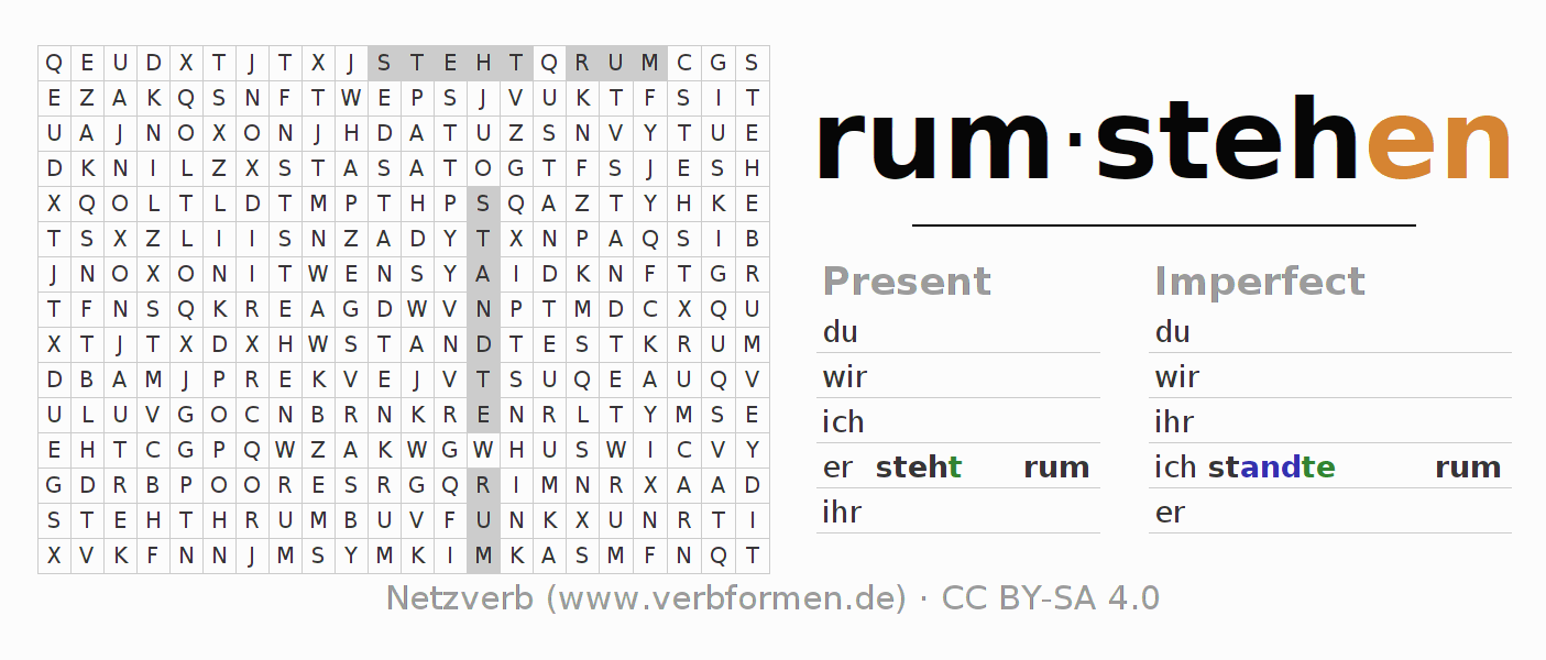 With these search word puzzles you can learn the conjugation of the German verb rumstehen.