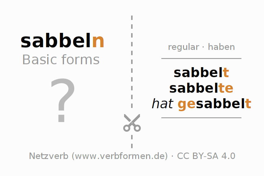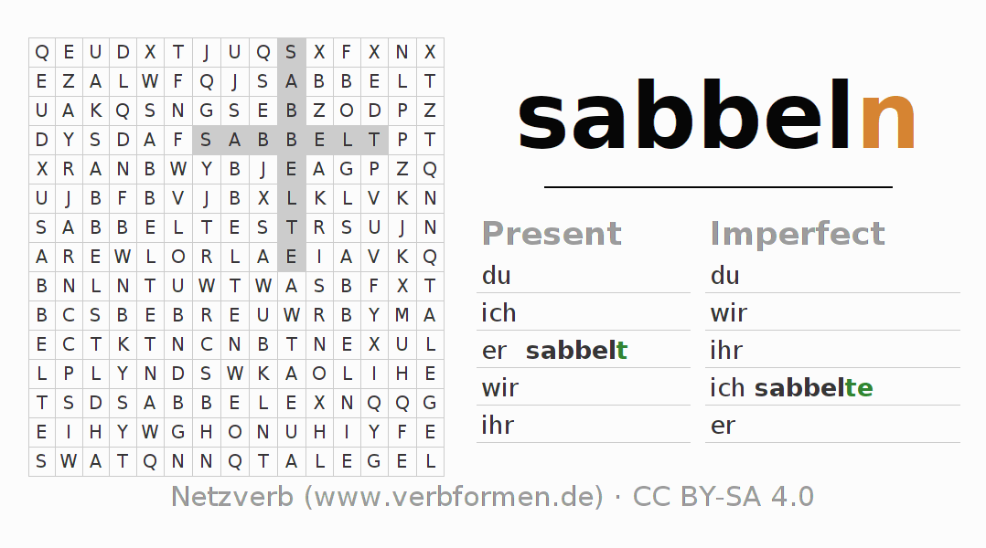 Worksheets are used generally for the conjugation of the verb sabbeln in teaching. The materials can be used as Open Educational Resources (OER) for exercises, for games and as Tasks (CC BY-SA 4.0). There are many different types of tasks available for the verb sabbeln. These are overview sheets with complete conjugation, puzzles and games that require joint learning. The entire educational material is available for free as a PDF download, as pictures and as an interactive browser version. In addition to the tasks, countless examples for sabbeln also provide an aid to using the verb.
