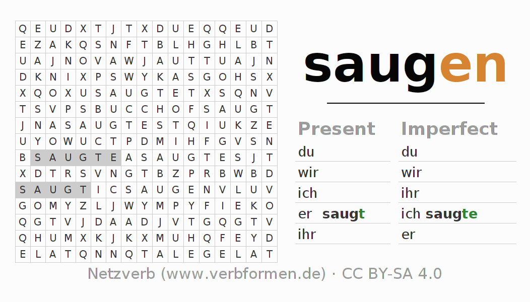 Worksheets are used generally for the conjugation of the verb saugen in teaching. The materials can be used as Open Educational Resources (OER) for exercises, for games and as Tasks (CC BY-SA 4.0). There are many different types of tasks available for the verb saugen. These are overview sheets with complete conjugation, puzzles and games that require joint learning. The entire educational material is available for free as a PDF download, as pictures and as an interactive browser version. In addition to the tasks, countless examples for saugen also provide an aid to using the verb.