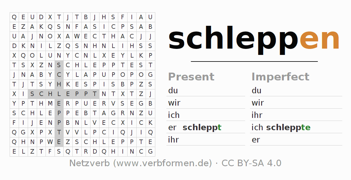 With these search word puzzles you can learn the conjugation of the German verb schleppen.