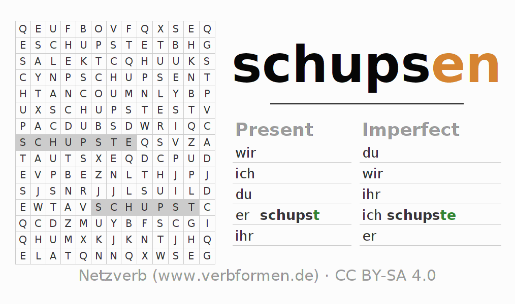 Worksheets are used generally for the conjugation of the verb schupsen in teaching. The materials can be used as Open Educational Resources (OER) for exercises, for games and as Tasks (CC BY-SA 4.0). There are many different types of tasks available for the verb schupsen. These are overview sheets with complete conjugation, puzzles and games that require joint learning. The entire educational material is available for free as a PDF download, as pictures and as an interactive browser version. In addition to the tasks, countless examples for schupsen also provide an aid to using the verb.