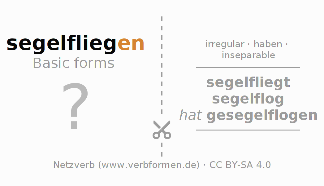 Worksheets are used generally for the conjugation of the verb segelfliegen in teaching. The materials can be used as Open Educational Resources (OER) for exercises, for games and as Tasks (CC BY-SA 4.0). There are many different types of tasks available for the verb segelfliegen. These are overview sheets with complete conjugation, puzzles and games that require joint learning. The entire educational material is available for free as a PDF download, as pictures and as an interactive browser version. In addition to the tasks, countless examples for segelfliegen also provide an aid to using the verb.