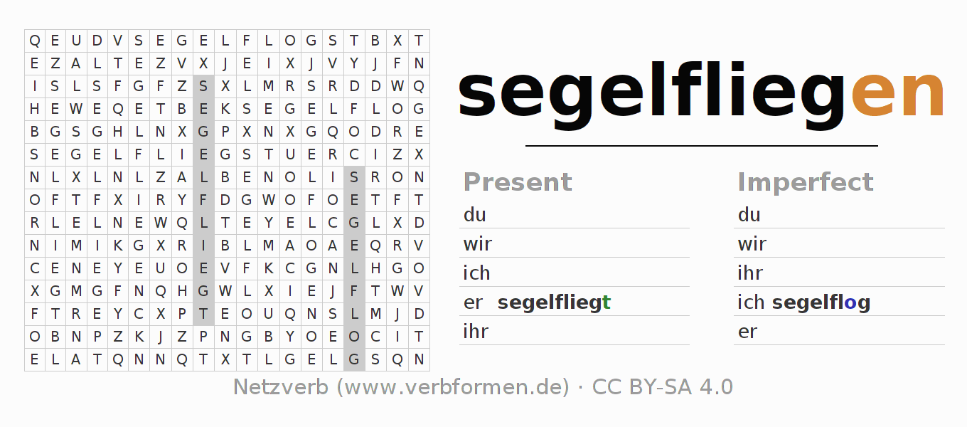 With these search word puzzles you can learn the conjugation of the German verb segelfliegen.