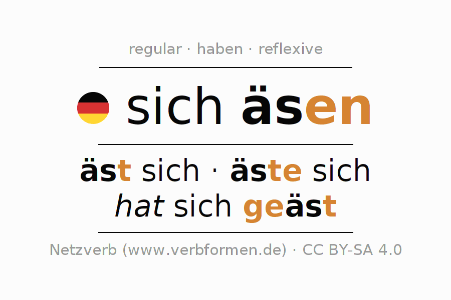 Worksheets are used generally for the conjugation of the verb äsen in teaching. The materials can be used as Open Educational Resources (OER) for exercises, for games and as Tasks (CC BY-SA 4.0). There are many different types of tasks available for the verb sich äsen. These are overview sheets with complete conjugation, puzzles and games that require joint learning. The entire educational material is available for free as a PDF download, as pictures and as an interactive browser version. In addition to the tasks, countless examples for äsen also provide an aid to using the verb.