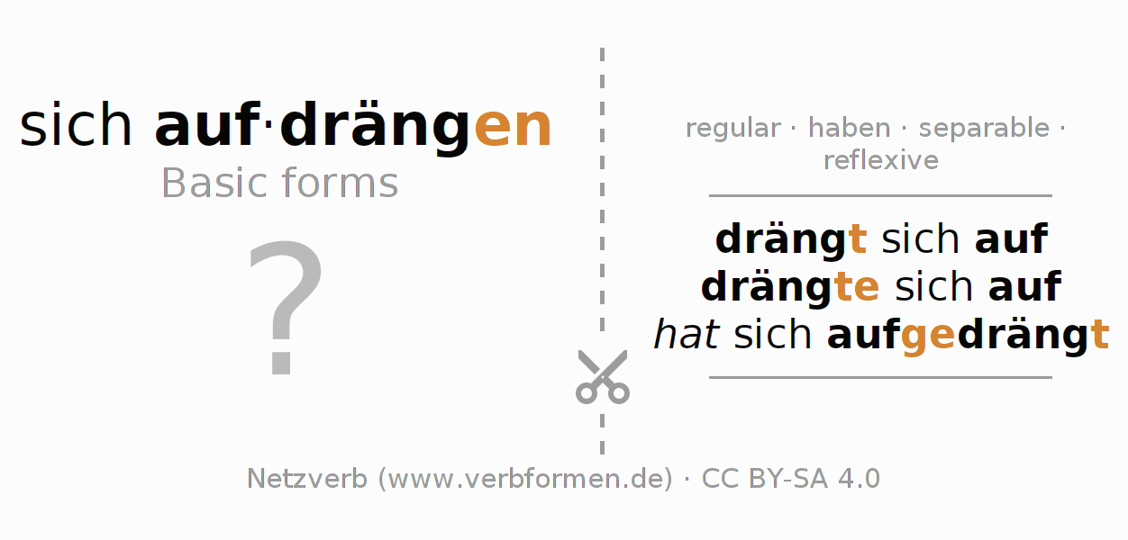 Worksheets are used generally for the conjugation of the verb aufdrängen in teaching. The materials can be used as Open Educational Resources (OER) for exercises, for games and as Tasks (CC BY-SA 4.0). There are many different types of tasks available for the verb sich aufdrängen. These are overview sheets with complete conjugation, puzzles and games that require joint learning. The entire educational material is available for free as a PDF download, as pictures and as an interactive browser version. In addition to the tasks, countless examples for aufdrängen also provide an aid to using the verb.