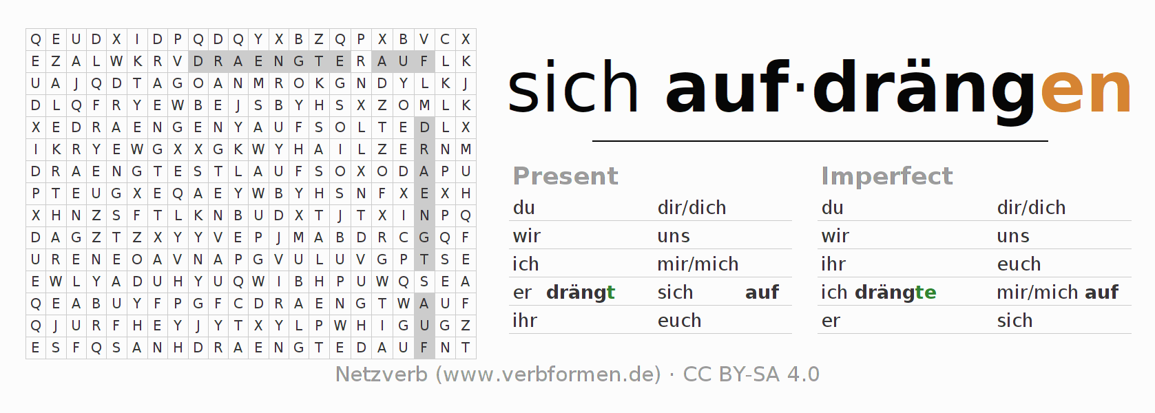 With these search word puzzles you can learn the conjugation of the German verb sich aufdrängen.