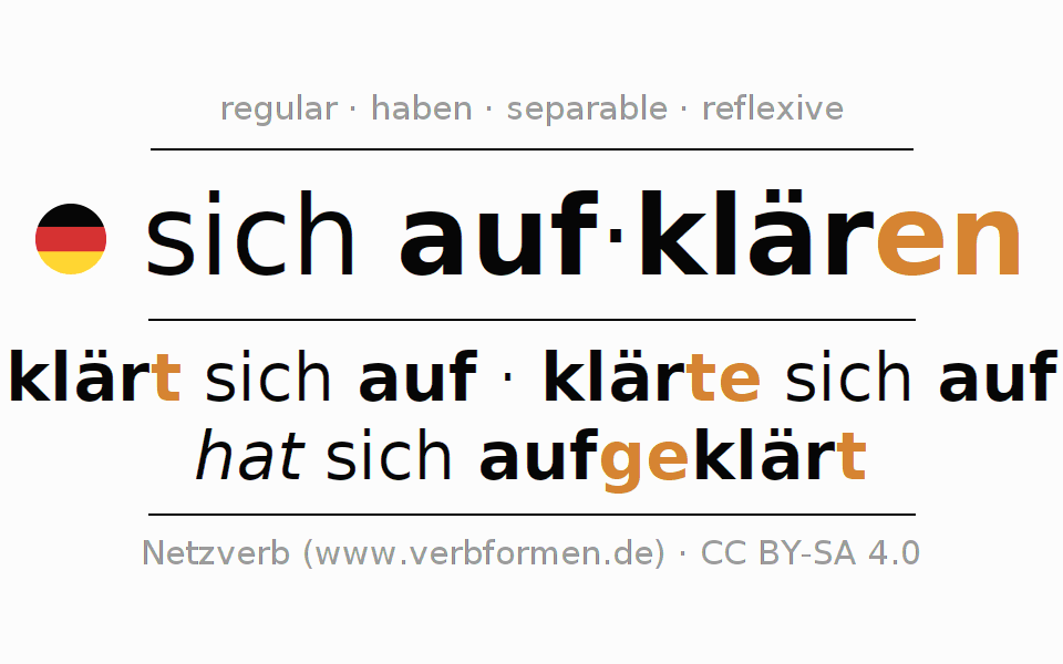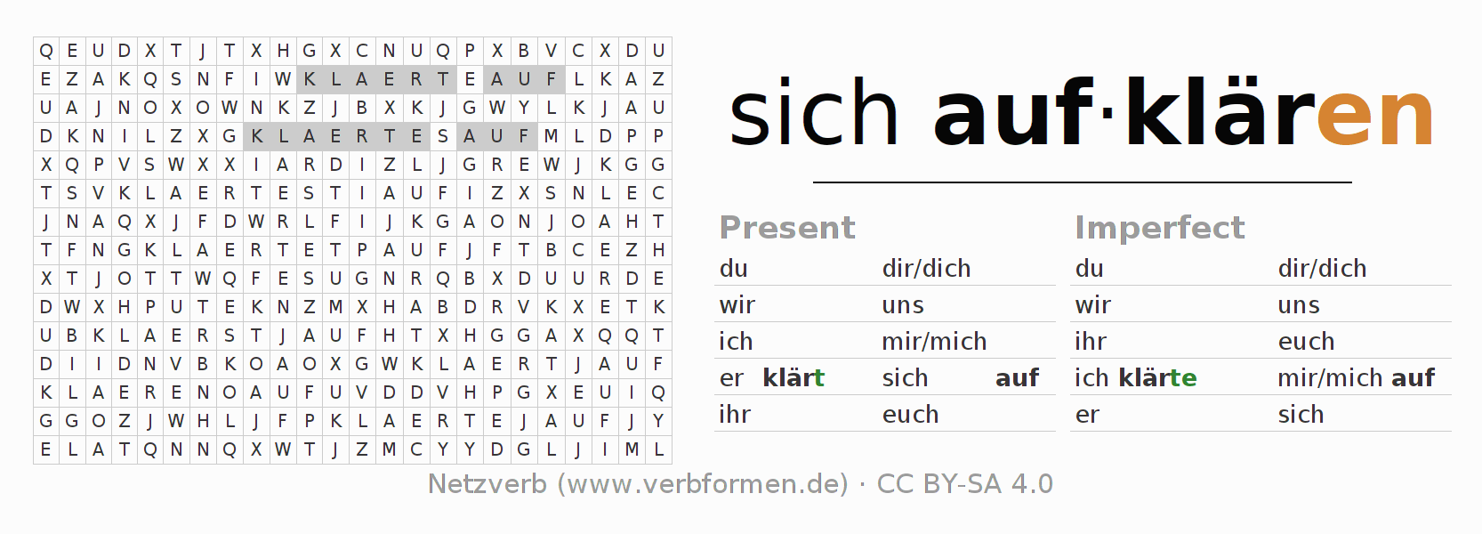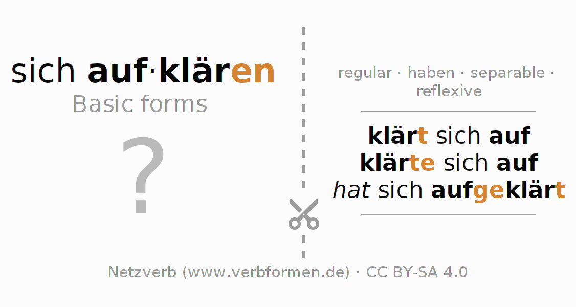 Worksheets are used generally for the conjugation of the verb aufklären in teaching. The materials can be used as Open Educational Resources (OER) for exercises, for games and as Tasks (CC BY-SA 4.0). There are many different types of tasks available for the verb sich aufklären. These are overview sheets with complete conjugation, puzzles and games that require joint learning. The entire educational material is available for free as a PDF download, as pictures and as an interactive browser version. In addition to the tasks, countless examples for aufklären also provide an aid to using the verb.