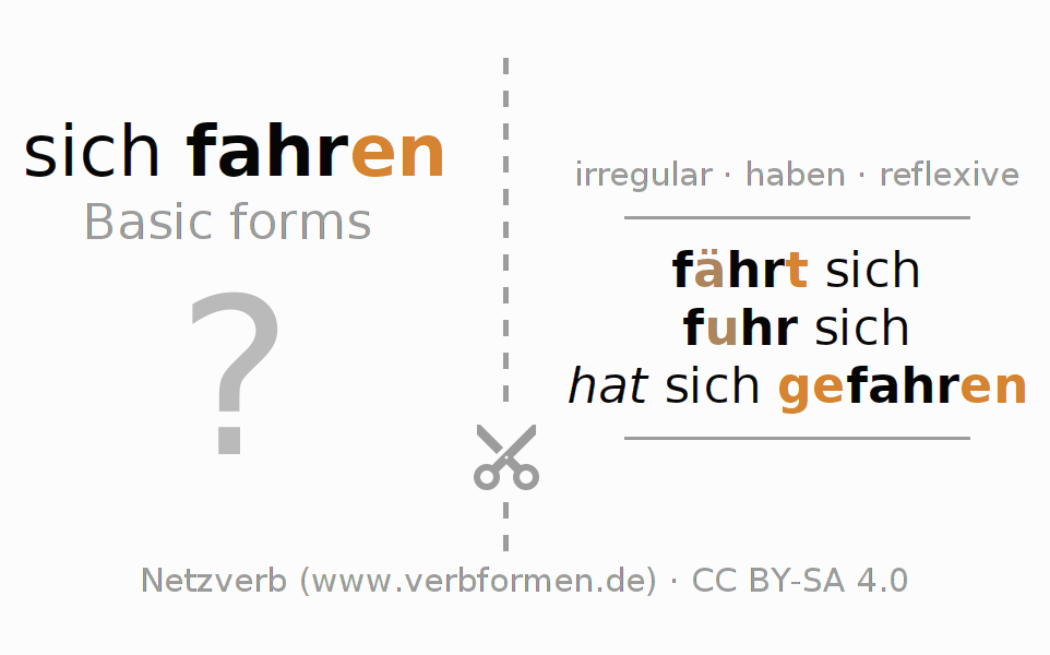 Worksheets are used generally for the conjugation of the verb fahren in teaching. The materials can be used as Open Educational Resources (OER) for exercises, for games and as Tasks (CC BY-SA 4.0). There are many different types of tasks available for the verb sich fahren (hat). These are overview sheets with complete conjugation, puzzles and games that require joint learning. The entire educational material is available for free as a PDF download, as pictures and as an interactive browser version. In addition to the tasks, countless examples for fahren also provide an aid to using the verb.