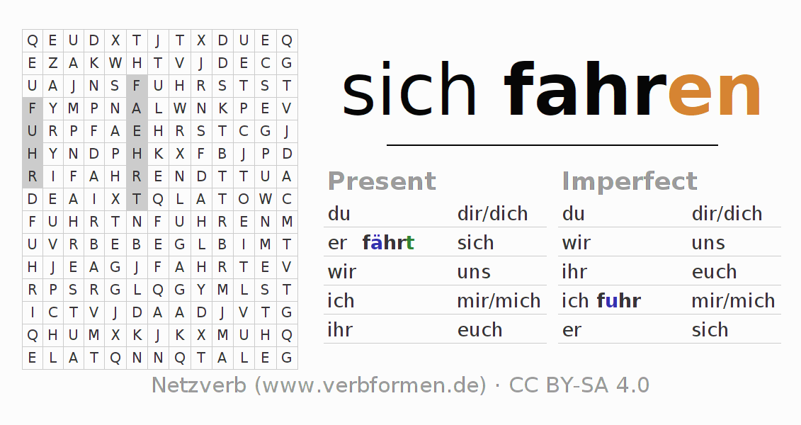 With these search word puzzles you can learn the conjugation of the German verb sich fahren.