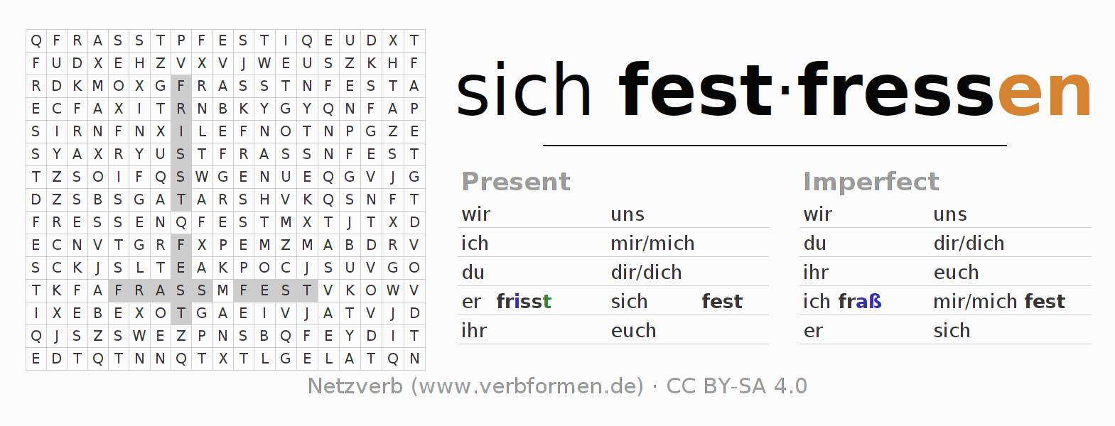 With these search word puzzles you can learn the conjugation of the German verb sich festfressen.