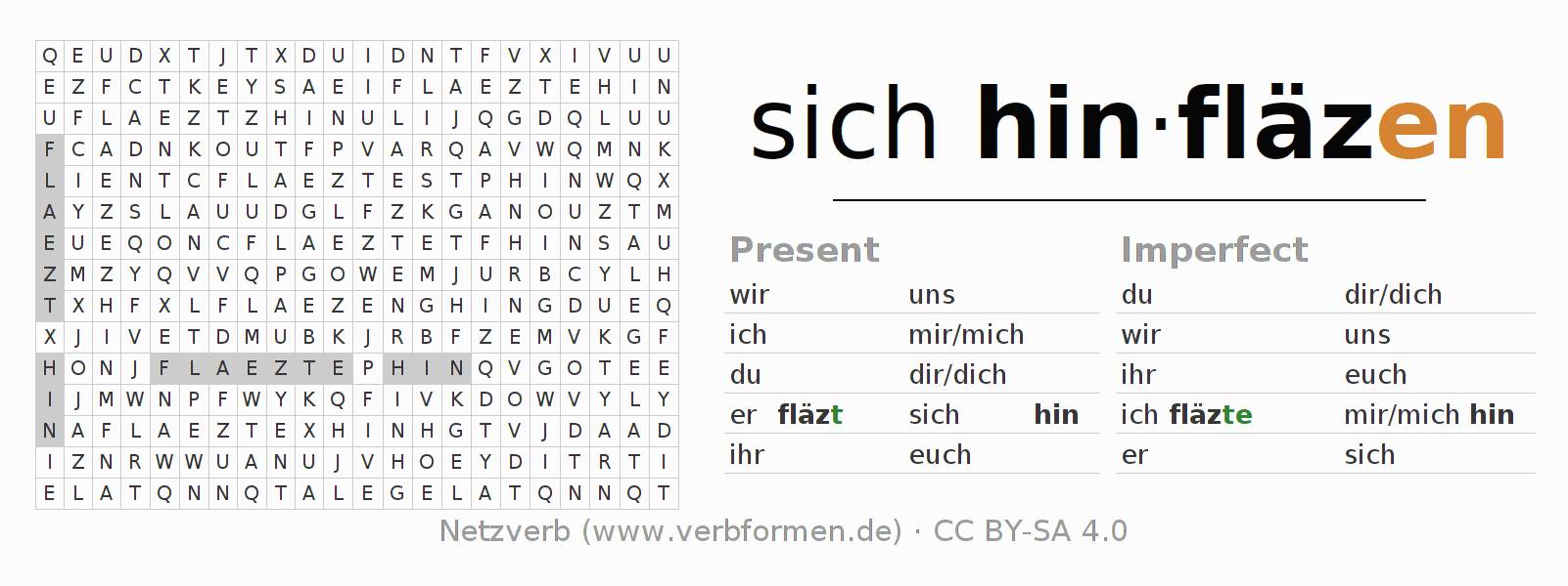 With these search word puzzles you can learn the conjugation of the German verb sich hinfläzen.