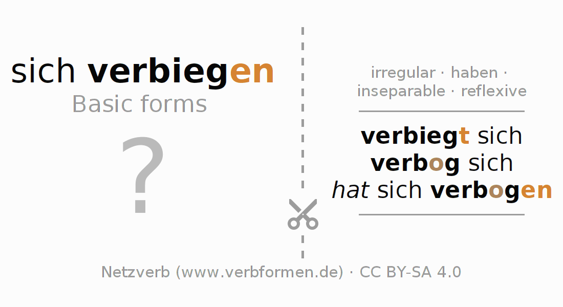 Worksheets are used generally for the conjugation of the verb verbiegen in teaching. The materials can be used as Open Educational Resources (OER) for exercises, for games and as Tasks (CC BY-SA 4.0). There are many different types of tasks available for the verb sich verbiegen. These are overview sheets with complete conjugation, puzzles and games that require joint learning. The entire educational material is available for free as a PDF download, as pictures and as an interactive browser version. In addition to the tasks, countless examples for verbiegen also provide an aid to using the verb.